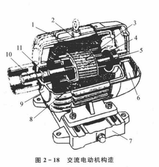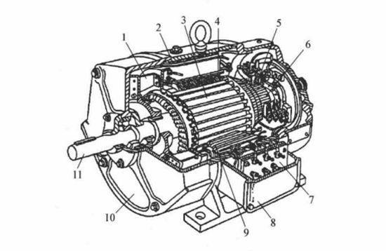 1一定子鐵芯;2一定子外殼;3一轉(zhuǎn)子鐵芯;4一轉(zhuǎn)子導(dǎo)體;5一端環(huán);6一冷卻風(fēng)扇;7一機(jī)座;8-定子繞組;9-軸承殼:10一軸:11-軸承