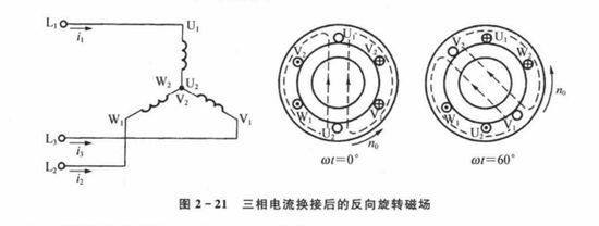 ②反向旋轉(zhuǎn)磁場。當(dāng)需要三相異步感應(yīng)電動機(jī)反方向轉(zhuǎn)動時(shí),只需將三相對稱交流電源中任意兩相對調(diào),三相異步感應(yīng)電動機(jī)即能反向旋轉(zhuǎn),如圖2-21所示。