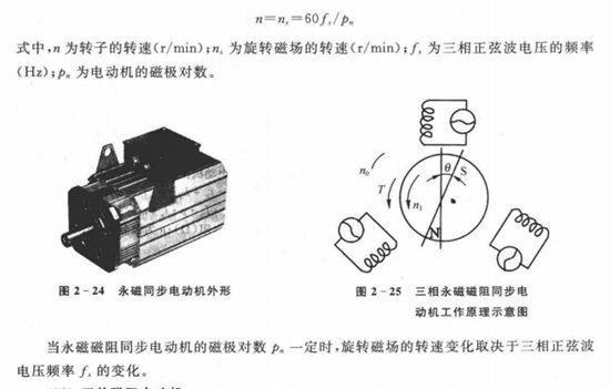 3.水磁同步電動機(jī)的工作原理。永磁同步電動機(jī)實(shí)際上是一種凸極式電動機(jī),一般其在定子結(jié)構(gòu)上采用與三相交流電動機(jī)相似的三相對稱繞組,交流電源通過交一直一交電壓型逆變器或直一交電壓型逆變器調(diào)制為電壓可變化的三相正弦波電壓,輸入永磁同步電動機(jī)三相對稱繞組后,產(chǎn)生三相對稱的三相電流,在正弦波定子電流和正弦波反電動勢的作用下,氣隙中產(chǎn)生旋轉(zhuǎn)磁場,帶動轉(zhuǎn)子跟隨旋轉(zhuǎn)磁場同步旋轉(zhuǎn),如圖2-25所示。