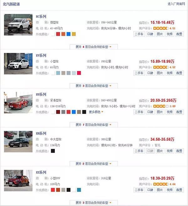 目前國內(nèi)純電動車型最多的是北汽新能源,產(chǎn)品有五大系列,從A00到B級車都有,也包含了兩廂車、轎車和SUV,雖然很多車型在新車型出來之后已經(jīng)退出,但是定價(jià)時(shí)難免同門相爭。EC系列和EV系列都是兩廂車,甚至和EX系列差別都不大。