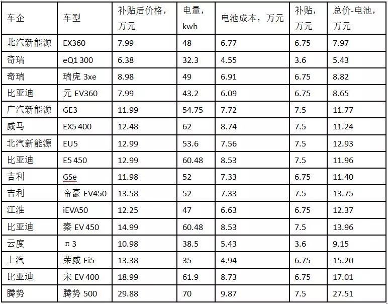 如果我們簡單計(jì)算其補(bǔ)貼,加上補(bǔ)貼后價(jià)格,得出其總價(jià)格,減去電池成本,就會發(fā)現(xiàn),還有相當(dāng)大的空間,扣除車身、電機(jī)、電控、小三電,以及其他配置、費(fèi)用,仍然有利可圖。