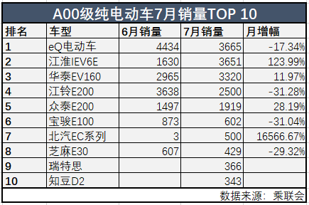 純電動A00級車型中,奇瑞eQ電動以3,665輛的銷量奪冠,但是比6月減少了17%。除華泰EV160、江鈴IEV6E和眾泰E200的銷量上漲之外,其余繼續(xù)大幅減少,不少車型銷量歸零。從絕對值看,為適應(yīng)補(bǔ)貼新政而升級了續(xù)駛里程的幾款A(yù)00級車,如奇瑞eQ電動、江淮IEV6E、眾泰E200的銷量依然為四位數(shù),北汽EC180在7月售出500輛。