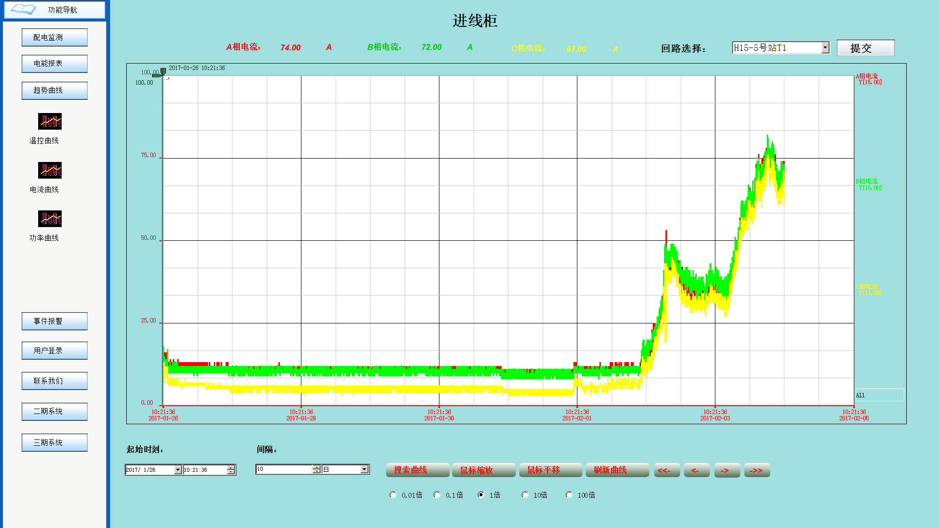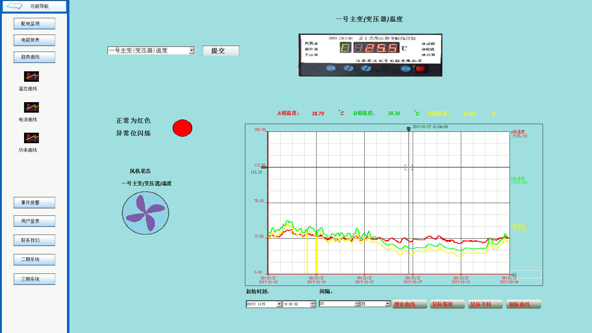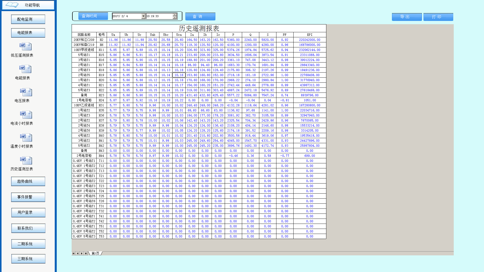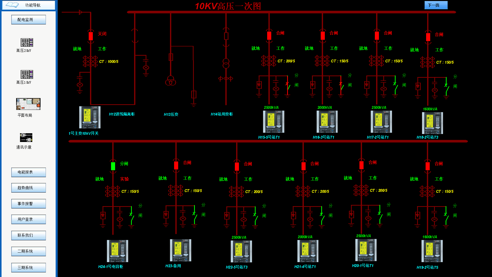 功能要求:高壓回路的一次圖界面應(yīng)顯示回路名稱、三相電流、三相線電壓、總有功功率、總無功功率、總功率因數(shù)、頻率和開關(guān)量光字牌。10kV配電系統(tǒng)中所需要監(jiān)測的開關(guān)量為:斷路器分合閘信號、手車工作/試驗(yàn)位置信號、遠(yuǎn)方/就地切換位置信號、彈簧儲能位信號、接地刀信號、超高溫跳閘信號、高溫報警信號、事故信號和預(yù)告報警信號;低壓進(jìn)線回路電參量界面顯示:回路名稱、開關(guān)狀態(tài)、三相電流、三相電壓、總有功功率、總無功功率、總功率因數(shù)、頻率和正向有功電能累計值。低壓出線回路界面顯示:回路名稱、開關(guān)狀態(tài)、三相(單相)電流。每個回路旁設(shè)置詳細(xì)參數(shù)按鈕,通過點(diǎn)擊可查看該回路詳細(xì)電參量,包括三相電流、三相電壓、總有功功率、分相有功功率、總無功功率、分相無功功率、總功率因數(shù)、分相功率因數(shù)、頻率、正向有功電能、反向有功電能、感性無功電能、容性無功電能。