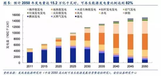 為了保證2030年前溫室氣體排放達(dá)到峰值的目標(biāo)實(shí)現(xiàn),我國(guó)需要發(fā)展高比例的可再生能源和高效率的能源系統(tǒng)。根據(jù)發(fā)改委能源研究所《中國(guó)2050高比例可再生能源發(fā)展情景暨途徑研究》的預(yù)測(cè),到2050年我國(guó)能源效率將比2010年提升90%,屆時(shí)可再生能源占一次能源比例達(dá)到62%,年發(fā)電量達(dá)15.2萬億千瓦時(shí),可再生能源發(fā)電量比例達(dá)到82%,非化石能源發(fā)電占比達(dá)到91%,煤電發(fā)電量占比下降到7%以下。