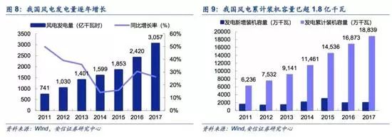 風(fēng)電將成為未來電力供應(yīng)的重要支柱。風(fēng)電作為一種可再生的發(fā)電方法,有著先天的競(jìng)爭(zhēng)優(yōu)勢(shì)。在環(huán)境保護(hù)上,風(fēng)電可以有效降低環(huán)境污染,提高能源清潔度,推動(dòng)能源無污染;在規(guī)模經(jīng)濟(jì)上,全球風(fēng)電成本在過去的七年間已經(jīng)降低了23%,在一些地區(qū)成本已經(jīng)低于化石燃料發(fā)電成本;在成長(zhǎng)潛力上,預(yù)計(jì)到2050年風(fēng)電在總發(fā)電量上的占比將達(dá)到35%。由于風(fēng)電相關(guān)技術(shù)的突破和成本的降低,以及全面深化電力體制改革的成功,預(yù)計(jì)風(fēng)電將得到迅猛發(fā)展。根據(jù)《風(fēng)電發(fā)展“十三五”規(guī)劃》設(shè)定的總量目標(biāo)是,到2020年底,風(fēng)電累計(jì)并網(wǎng)裝機(jī)容量確保達(dá)到2.1億千瓦以上,其中海上風(fēng)電并網(wǎng)裝機(jī)容量達(dá)到500萬千瓦以上;風(fēng)電新增裝機(jī)容量8000萬千瓦以上,其中海上風(fēng)電新增容量400萬千瓦以上;風(fēng)電年發(fā)電量確保達(dá)到 4200 億千瓦時(shí),約占全國(guó)總發(fā)電量的 6%。
