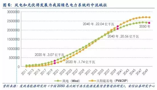 風(fēng)電和光伏將發(fā)展為我國(guó)綠色電力系統(tǒng)的中流砥柱,預(yù)計(jì)在2020年至2040年得到迅猛發(fā)展:平均每年新增裝機(jī)容量接近1億千瓦,到2050年實(shí)現(xiàn)24億千瓦風(fēng)電和27億太陽能發(fā)電,年發(fā)電9.66萬億千瓦時(shí),占全部發(fā)電量的64%。技術(shù)突破、成本降低和新電改的成功將成為風(fēng)電光伏跨越式發(fā)展的關(guān)鍵因素。