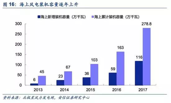 我國海上風(fēng)電迎來加速發(fā)展期。“十二五”期間,中國海上風(fēng)電發(fā)展較為緩慢,到2015年末,海上風(fēng)電累計(jì)裝機(jī)為103萬千瓦,遠(yuǎn)低于之前規(guī)劃的目標(biāo),主要原因是技術(shù)尚有待完善,開發(fā)海上風(fēng)電的經(jīng)濟(jì)性不強(qiáng),企業(yè)積極性不高。進(jìn)入“十三五”,隨著海上風(fēng)電政策支持力度加大,設(shè)備及安裝成本降低以及配套產(chǎn)業(yè)日漸成熟,海上風(fēng)電正迎來加速發(fā)展期。2017年,我國海上風(fēng)電裝機(jī)實(shí)現(xiàn)大幅度增長,海上風(fēng)電新增裝機(jī)為116萬千瓦,同比增長97%,截止2017年底,我國海上風(fēng)電累計(jì)裝機(jī)容量約為280萬千瓦。根據(jù)我國《可再生能源發(fā)展“十三五”規(guī)劃》,到2020年,全國海上風(fēng)電開工建設(shè)規(guī)模達(dá)到1000萬千瓦,力爭累計(jì)并網(wǎng)容量達(dá)到500萬千瓦以上,新增裝機(jī)容量400萬千瓦以上,預(yù)計(jì)實(shí)際規(guī)模將超預(yù)期。