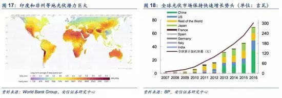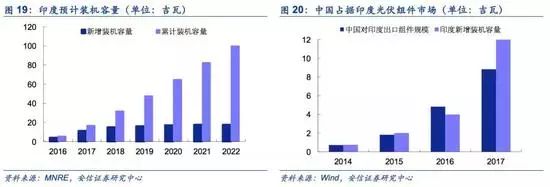中國光伏產(chǎn)業(yè)全面占領(lǐng)新興光伏市場。光伏技術(shù)是我國為數(shù)不多的掌握全產(chǎn)業(yè)鏈核心技術(shù)、自主知識(shí)產(chǎn)權(quán)、規(guī)?;a(chǎn)能以及成本優(yōu)勢的行業(yè)。根據(jù)工信部報(bào)告,我國產(chǎn)業(yè)鏈各環(huán)節(jié)都超過50%,多晶硅、硅片、電池、組件的產(chǎn)能占比達(dá)到56%、96、76%、79%。伴隨著政策刺激和技術(shù)突破雙向利好,中國光伏產(chǎn)業(yè)和光伏市場在全球光伏格局變化中領(lǐng)跑。其中,崛起最快的印度本土組件產(chǎn)能有限,嚴(yán)重依賴中國進(jìn)口。2017年裝機(jī)10GW,組件90%以上依賴進(jìn)口,80%以上從中國進(jìn)口。除印度市場以外、南美、中東等新興市場也正在快速成長。根據(jù)海關(guān)數(shù)據(jù),2016年中國對印度、馬來西亞、巴西以及越南的光伏產(chǎn)品出口額分別增長79.9%、132.3%、832.1%、208.5%。這些新興市場的規(guī)模化發(fā)展,將在一定程度上彌補(bǔ)美國、日本等傳統(tǒng)市場的需求下滑。