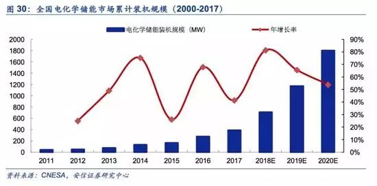 “十三五”期間,儲(chǔ)能有望找到切入口實(shí)現(xiàn)商業(yè)化應(yīng)用。2017年,我國(guó)在政策上已經(jīng)賦予了第三方利用儲(chǔ)能設(shè)備、需求側(cè)資源參與提供電力輔助服務(wù)的權(quán)利,相關(guān)運(yùn)行機(jī)制和補(bǔ)償價(jià)格也在醞釀和試行中,未來用戶側(cè)儲(chǔ)能的商業(yè)模式有望與電網(wǎng)側(cè)的商業(yè)模式逐步融合。根據(jù)CNESA預(yù)測(cè),儲(chǔ)能應(yīng)用于調(diào)頻輔助服務(wù)領(lǐng)域的比例在2020年預(yù)計(jì)可以達(dá)到18%,是目前市場(chǎng)份額的2倍。