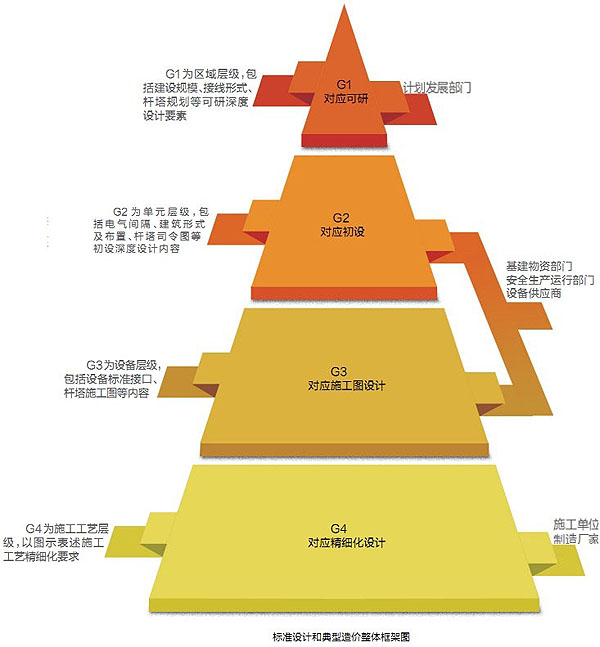 特別是在設(shè)計(jì)上,建立起G1到G4(即區(qū)域、單元、設(shè)備、施工工藝)四個(gè)層級(jí)的架構(gòu),呈“金字塔”結(jié)構(gòu),逐級(jí)遞進(jìn),滿足了基建工程設(shè)計(jì)各階段要求,打通了與各相關(guān)領(lǐng)域的接口:G1層與計(jì)劃發(fā)展部門銜接,簡化設(shè)計(jì)程序,前期工作重點(diǎn)內(nèi)容更突出;G2層與生產(chǎn)運(yùn)行部門、物資部門銜接,在技術(shù)方案中體現(xiàn)各部門要求,實(shí)現(xiàn)標(biāo)準(zhǔn)設(shè)計(jì);G3層與物資部門、設(shè)備供應(yīng)商銜接,固化設(shè)備安裝方式及接口形式,實(shí)現(xiàn)標(biāo)準(zhǔn)采購;G4層與施工單位、制造廠商銜接,規(guī)范施工作業(yè)過程及工藝,實(shí)現(xiàn)標(biāo)準(zhǔn)施工。