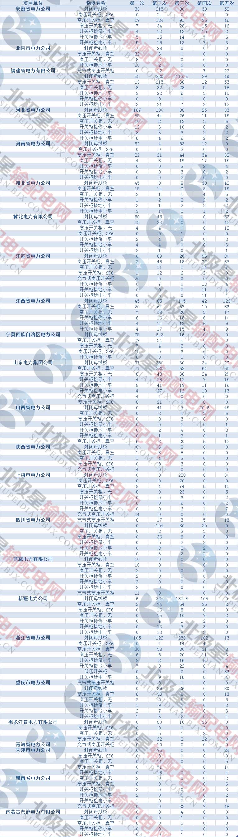 國家電網(wǎng)公司輸變電項目變電設(shè)備招標1-5批次30(20)KV開關(guān)柜招標情況