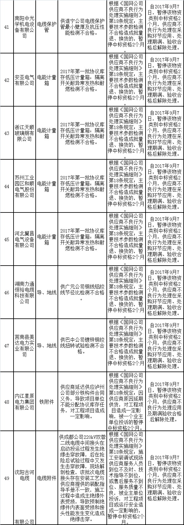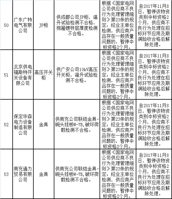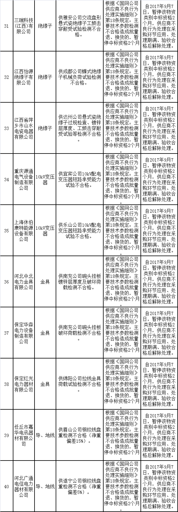 為促進(jìn)供應(yīng)商誠(chéng)信履約,保證產(chǎn)品質(zhì)量,確保電網(wǎng)建設(shè)順利進(jìn)行及安全可靠供電,依據(jù)《國(guó)家電網(wǎng)公司供應(yīng)商不良行為處理管理細(xì)則》的有關(guān)規(guī)定,對(duì)出現(xiàn)產(chǎn)品質(zhì)量問題、履約不誠(chéng)信等問題的供應(yīng)商進(jìn)行了處理。具體處理情