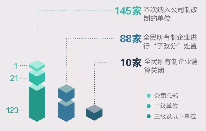 包括公司總部,本次納入公司制改制的單位有145家,其中二級單位21家,三級及以下單位123家。此外,還有88家全民所有制企業(yè)進行“子改分”處置,10家全民所有制企業(yè)清算關閉。整體改制數量在中央企業(yè)中排名靠前。