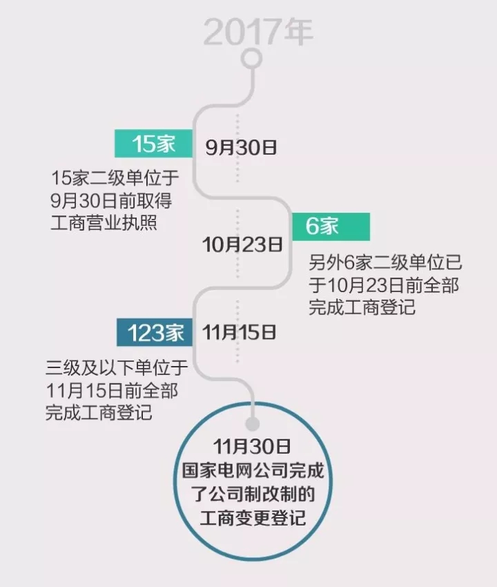 2017年11月30日,國家電網公司完成了公司制改制的工商變更登記。近日,國家電網取得改制后的工商營業(yè)執(zhí)照。至此,國家電網總部和系統(tǒng)144家全民所有制企業(yè)實現華麗變身,全部提前完成公司制改制,由全民所有制企業(yè)