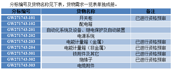 本次招標(biāo)項(xiàng)目中GW271742-101;203;204;301;302分標(biāo)已完成資格預(yù)審工作,通過資格預(yù)審的申請(qǐng)人(依據(jù)招標(biāo)人招投標(biāo)交易平臺(tái)信息系統(tǒng)http://ecp.sgcc.com.cn公共信息中關(guān)于“國網(wǎng)甘肅省電力公司2017年10kV及以下配網(wǎng)物資類招標(biāo)資格預(yù)審 結(jié)果公告”)方有資格參加相應(yīng)分標(biāo)的投標(biāo);其余分標(biāo)采用公開招標(biāo)方式邀請(qǐng)有興趣的合格投標(biāo)人(以下簡稱“投標(biāo)人”)。