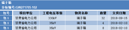 國網(wǎng)甘肅省電力公司2017年第五次物資招標(biāo)采購招標(biāo)公告,此次招標(biāo)涉及的物資有:35kV 變壓器、端子箱、瓷柱式交流斷路器、智能變電站測控及在線監(jiān)測系統(tǒng)、繼電保護(hù)及自動裝置、智能變電站電源系統(tǒng)、電源系統(tǒng)、軟