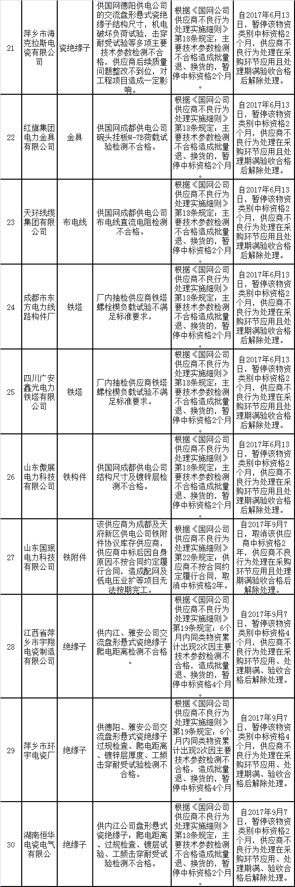 為促進(jìn)供應(yīng)商誠(chéng)信履約,保證產(chǎn)品質(zhì)量,確保電網(wǎng)建設(shè)順利進(jìn)行及安全可靠供電,依據(jù)《國(guó)家電網(wǎng)公司供應(yīng)商不良行為處理管理細(xì)則》的有關(guān)規(guī)定,對(duì)出現(xiàn)產(chǎn)品質(zhì)量問(wèn)題、履約不誠(chéng)信等問(wèn)題的供應(yīng)商進(jìn)行了處理。具體處理情況如下: