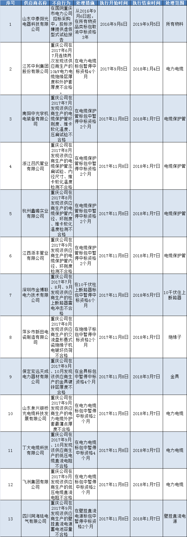 國(guó)網(wǎng)(重慶)通報(bào)的供應(yīng)商不良行為處理情況(2017.11)