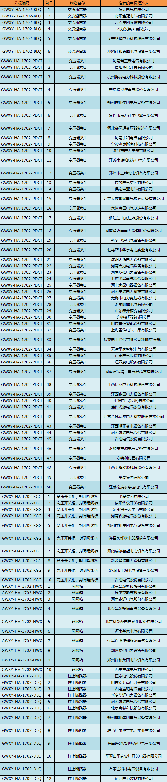 國(guó)網(wǎng)河南2017年第二次配網(wǎng)設(shè)備/線材協(xié)議庫(kù)存貨物招標(biāo)中標(biāo)候選人