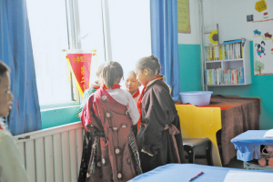 課間,青?,敹嗝褡寮乃拗浦袑W(xué)學(xué)生圍在溫暖的暖氣片旁說著知心話。白強 攝