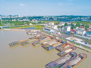 京杭大運河沿線湖州城東水上服務(wù)區(qū)岸電設(shè)施鳥瞰圖。 徐昱 攝