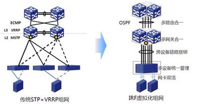 之前的數(shù)據(jù)中心廣泛采用傳統(tǒng)的STP技術(shù),存在設(shè)備鏈路利用率低下、意外環(huán)路導(dǎo)致廣播風(fēng)暴、VLAN規(guī)劃復(fù)雜、設(shè)備管理及運(yùn)維困難等問題,而使用IRF2后,二層不需要生成樹;三層不需要VRRP;多臺設(shè)備只需管理一臺,配置一次,讓網(wǎng)絡(luò)更簡單。