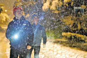 1月4日,安徽六安供電公司配網(wǎng)搶修巡視人員連夜冒雪查找故障點(diǎn)。翁懷龍 攝