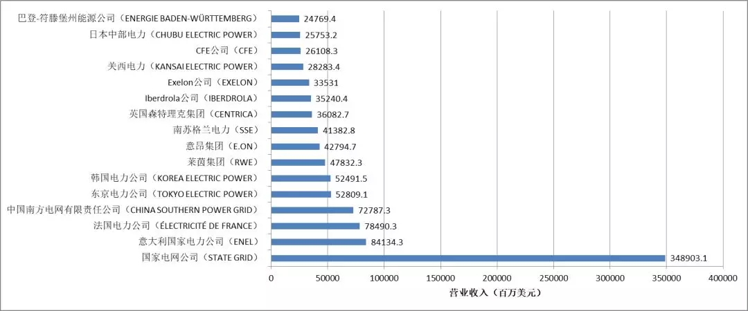 全世界共有16家主營業(yè)務涉及電網(wǎng)的企業(yè)上榜。電網(wǎng)企業(yè)中,國家電網(wǎng)以348903.1百萬美元的營業(yè)收入高居第一,且總收入是第二名意大利電力的四倍以上,在總榜單中與去年保持一致,名列第二。南方電網(wǎng)以72787.3百萬美元的收入排名第四,在總榜單中與去年相比下降十名,名列第一百一十名。