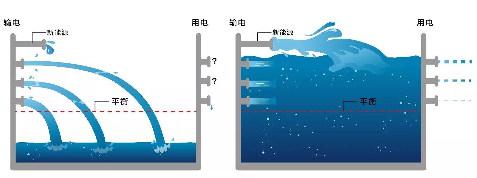電網(wǎng)系統(tǒng)像一個(gè)超大的蓄水池,在沒有新能源加入的時(shí)候,進(jìn)水管和出水管水流平穩(wěn),大家各取所需。