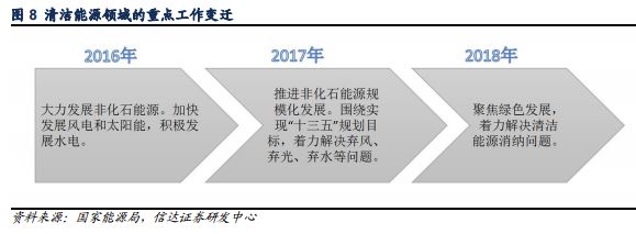 2018年能源工作會(huì)議提出,要聚焦綠色發(fā)展,著力解決清潔能源消納問(wèn)題,著力推進(jìn)能源結(jié)構(gòu)調(diào)整戰(zhàn)略工程,統(tǒng)籌推進(jìn)煤炭清潔高效利用,大力推進(jìn)能源清潔發(fā)展水平。歷年的全國(guó)能源工作會(huì)議顯示,清潔能源發(fā)展的重點(diǎn)工作,已經(jīng)從過(guò)去的大規(guī)模加速發(fā)展,轉(zhuǎn)變?yōu)榻鉀Q消納的問(wèn)題上來(lái)了。