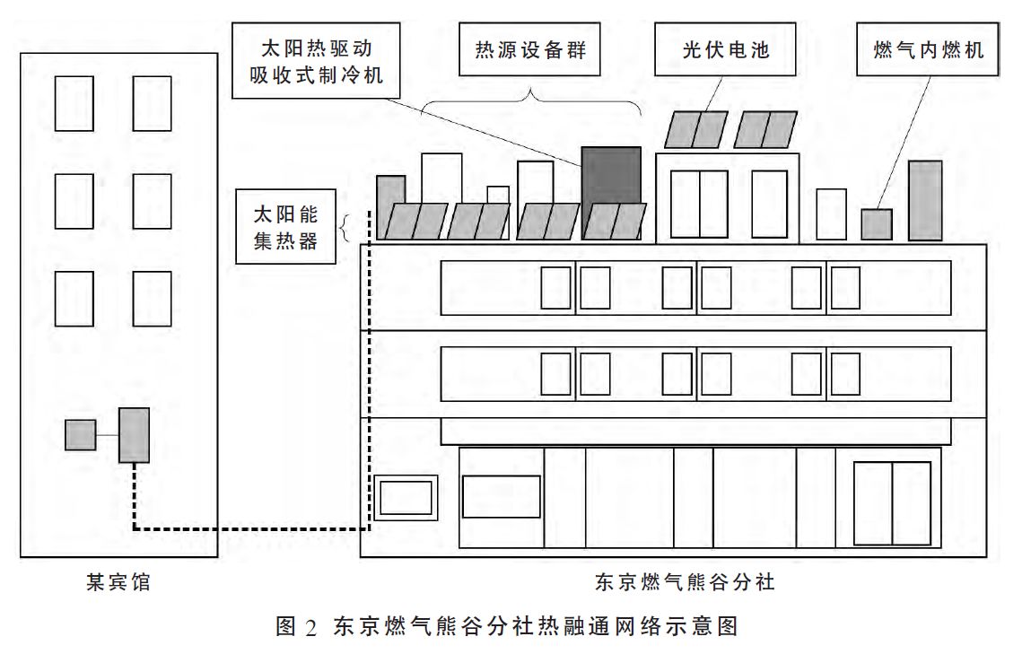 根據(jù)日本于2008年修正的節(jié)能法,2000m2以下中小規(guī)模樓宇需要進行節(jié)能改造。在此背景下,東京燃氣熊谷分社(建于1984年,建筑面積1400m2)和相鄰的賓館(建于1986年,建筑面積為8940m2)于2009年進行了協(xié)同節(jié)能改造,通過構(gòu)建熱融通系統(tǒng),確立了新型能源面域利用模式。