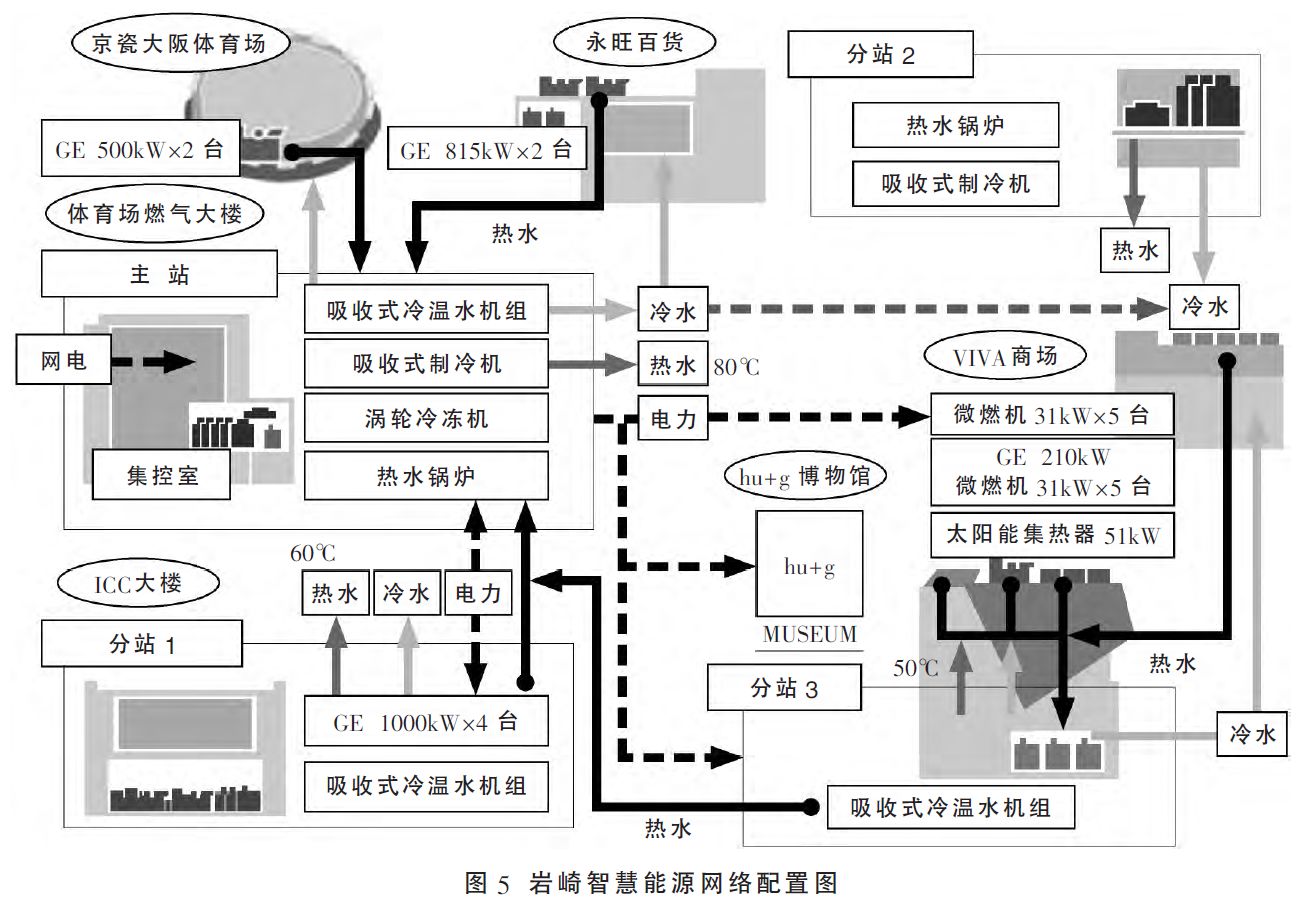 永旺百貨配有1630kW的熱電聯(lián)產(chǎn)機組,京瓷體育場配置有1000kW熱電聯(lián)產(chǎn)機組,“hu+g”博物館配有停電對應(yīng)型熱電聯(lián)產(chǎn)機組(420kW)、SOFC燃料電池(4kW)、太陽能集熱器(120kW)、光伏發(fā)電系統(tǒng)(20kW)和蓄電池(50kW˙h)。區(qū)域內(nèi)建筑用戶與能源站進行電、熱融通,從面域?qū)用鏄?gòu)建高效能源利用體系。